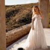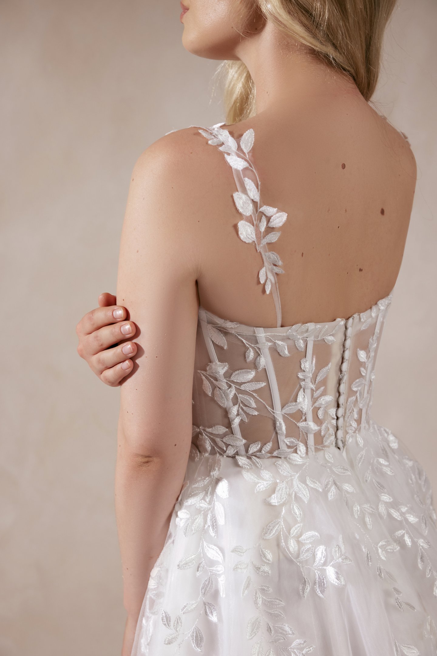 Νεανικό νυφικό σε Α-γραμμη με λαμπερή φούστα και μπούστο με απλικαρισμένα φλοραλ μοτιφ και αποσπώμενες τιράντες