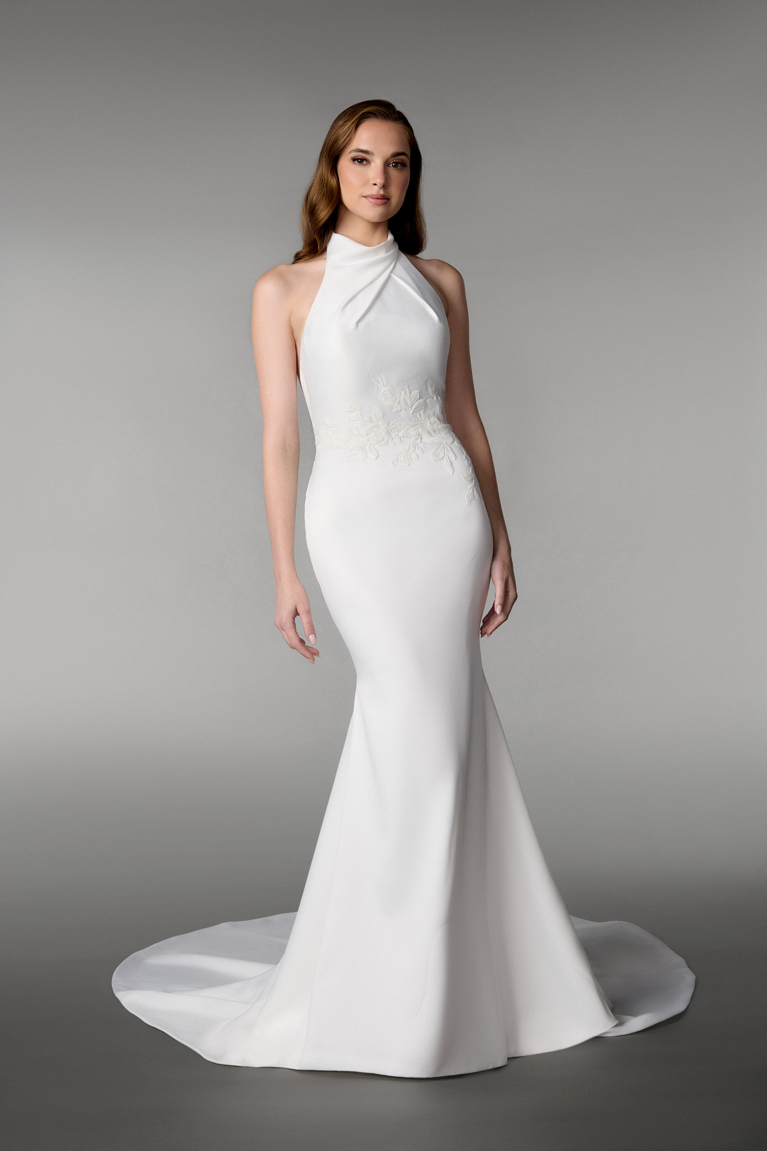 Νυφικό fit and flare από μεταξωτό κρεπ με λαιμόκοψη halter και ανοιχτή πλάτη private collection