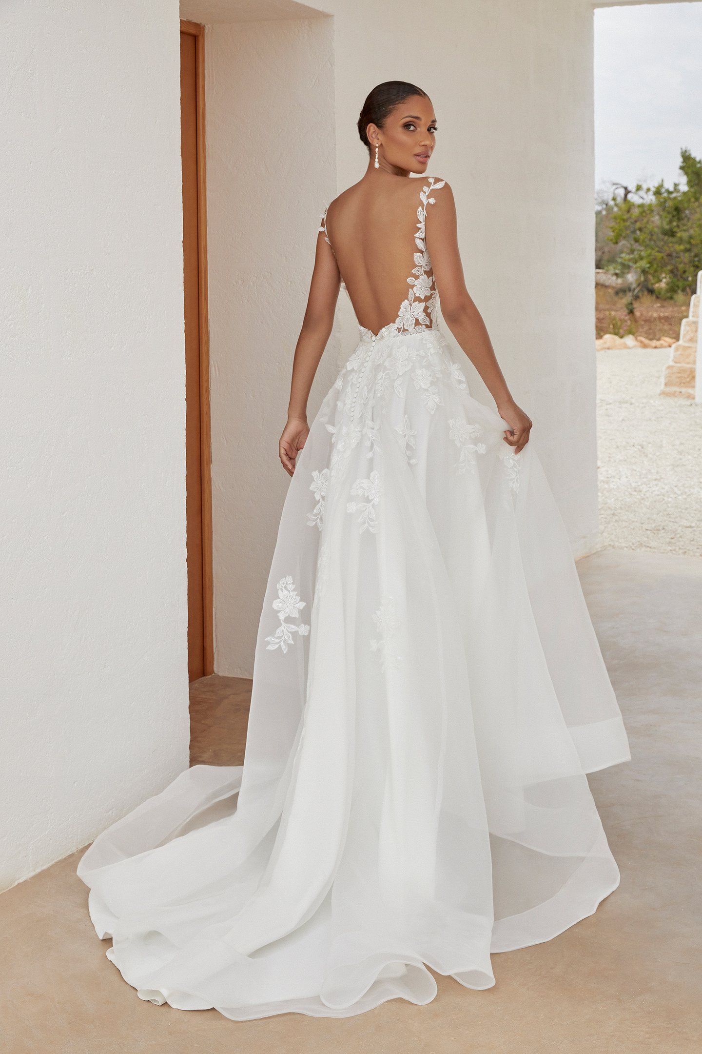 Νυφικό σε Α-γραμμη από μεταξωτή οργάντζα και δαντελένια φλοραλ μοτιφ. Βαθύ V ντεκολτέ και εντυπωσιακή χαμηλή πλάτη